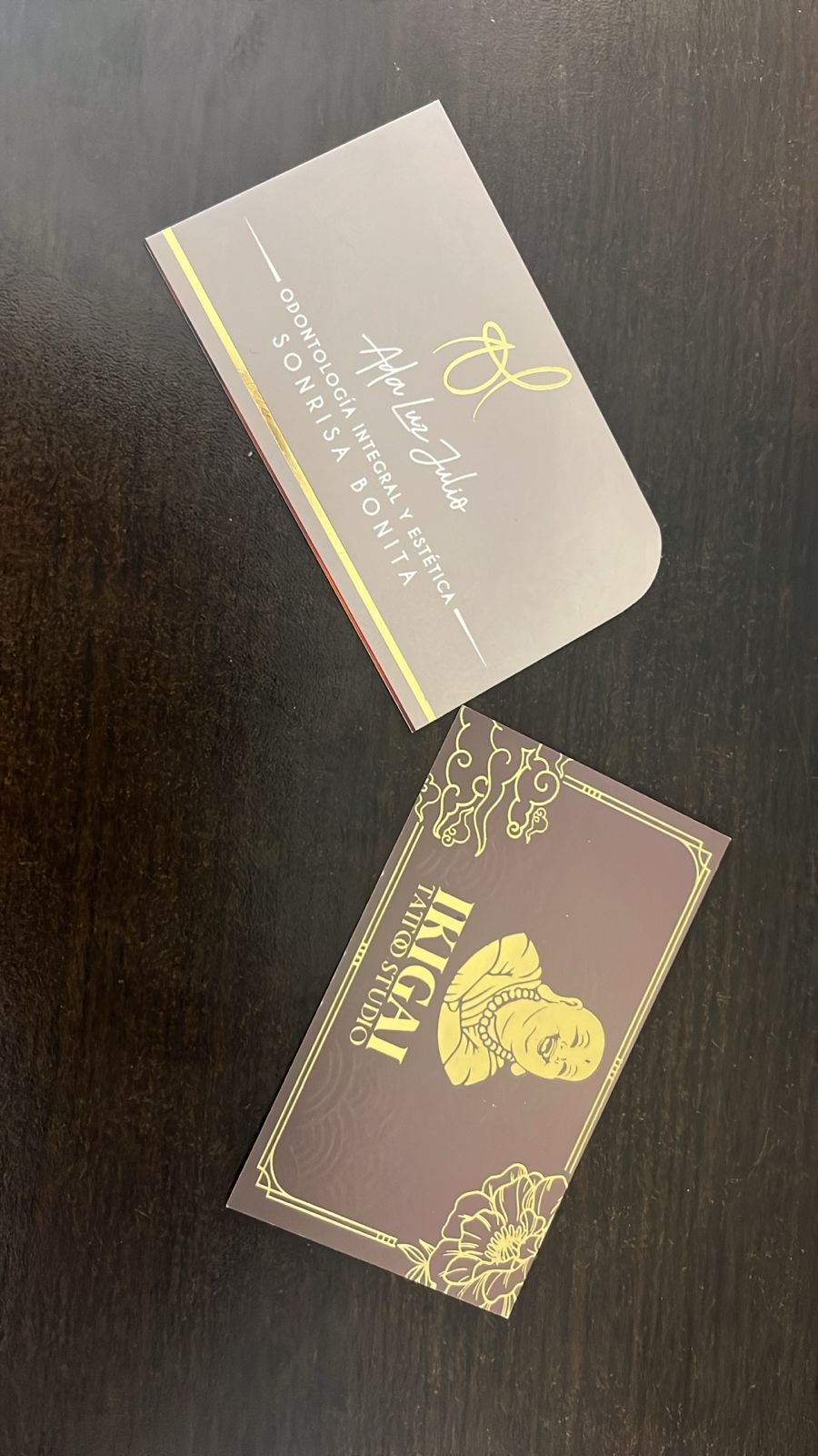 Las tarjetas de presentación mate con filtro UV y estampado dorado combinan elegancia y exclusividad. El acabado mate ofrece una apariencia sofisticada, mientras el barniz UV resalta detalles del diseño y el estampado dorado aporta un toque premium que hace destacar tu marca.